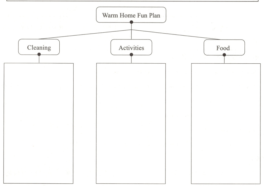 1. 假如你要举办暖房派对,根据以下短语,完成思维导图,并在每项中补充2个相关短语。