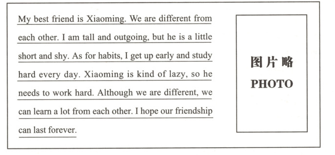 , so I hope our friendship can last forever. (e.g. touch my heart, share everything with me ...)2. 制作最佳拍档的秘密档案。请贴入照片,并结合上面的信息用英语对比你和你朋友的异同,50~70词。