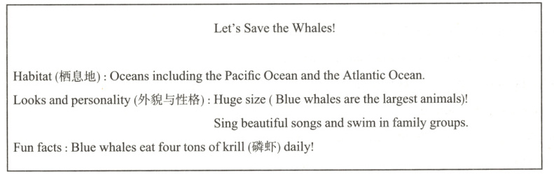 5. 请你根据海报,用英语向你的同学们介绍你所宣传的动物。