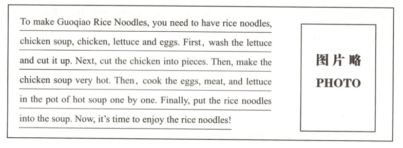 (put the rice noodles into the soup)2. 制作过桥米线简稿。请贴入照片,并结合上面的信息用英语写出制作过程。50~60词。