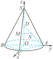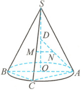 【例 3】如下图所示,在圆锥 $ SO $ 中,$ AB $ 是底面圆直径,$ SO = AB = 4 $,$ AC = BC $,$ D $ 为 $ SO $ 的中点,点 $ M $,$ N $ 分别在直线 $ SC $,$ AD $ 上,则线段 $ MN $ 的最小值为()