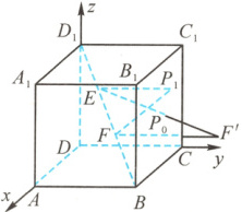 解析 过 $ F $ 作 $ F $ 关于平面 $ BCC_{1}B_{1} $ 的对称点 $ F' $,连接 $ EF' $ 交平面 $ BCC_{1}B_{1} $ 于点 $ P_{0} $,如下图所示。