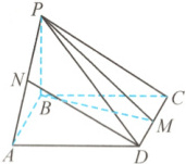 (2)因为$CD\perp$平面$PBM,PB\subset$平面$PBM$,所以$CD\perp PB$,又因为$PB\perp BM,BM\cap CD = M$,$BM,CD\subset$平面$ABCD$,所以$PB\perp$平面$ABCD$。方法一:延长$AD,BM$交于点$Q$,连结$PQ$。因为四边形$ABCD$为菱形,所以$AB// CD$且$AB = CD$。因为$M$为$DC$中点,所以$AB// DM$且$DM=\frac{1}{2}AB$,所以$D$为$AQ$中点。因为$N$为$PA$中点,所以$DN// PQ$,所以直线$DN$与平面$PBC$所成角即为直线$PQ$与平面$PBC$所成角。$V_{P - BCQ}=\frac{1}{3}· PB· S_{\triangle BCQ}$ $=\frac{1}{3}×1×(\frac{1}{2}×2\sqrt{3}×1)=\frac{\sqrt{3}}{3}$。设$Q$到平面$PBC$的距离为$h$,$V_{P - BCQ}=V_{Q - PBC}=\frac{1}{3}· h· S_{\triangle PBC}$ $=\frac{1}{3}h(\frac{1}{2}×1×2)=\frac{h}{3}$,所以$h=\sqrt{3}$在$\triangle PBQ$中,$PQ^2=PB^2+BQ^2=1+(2\sqrt{3})^2=13$,则$PQ=\sqrt{13}$设$PQ$与平面$PBC$所成角为$\theta$,则$\sin\theta=\frac{h}{PQ}=\frac{\sqrt{3}}{\sqrt{13}}=\frac{\sqrt{39}}{13}$,所以直线$DN$与平面$PBC$所成角的正弦值为$\frac{\sqrt{39}}{13}$。方法二:因为$BA\perp BM,PB\perp$平面$ABCD$,所以$BA,BM,BP$两两垂直。以$B$为原点,$BA,BM,BP$所在直线分别为$x,y,z$轴,建立如下图所示的空间直角坐标系,