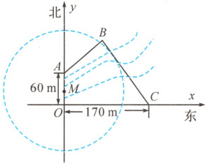 变式6 如下图所示,为保护河上古桥$OA$,规划建一座新桥$BC$,同时设立一个圆形保护区.规划要求:新桥$BC$与河岸$AB$垂直;保护区的边界为圆心$M$在线段$OA$上,并与$BC$相切的圆,且古桥两端$O$和$A$到该圆上任意一点的距离均不小于$80m$.经测量,点$A$位于点$O$正北方向$60m$处,点$C$位于点$O$正东方向$170m$处($OC$为河岸),$\tan \angle BCO = \frac{4}{3}$,则新桥$BC$的长度为.