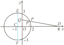 解析 当 $k = 0$ 时,$l_1:y = 3$,$l_2:x = -1$,此时 $l_1 \perp l_2$,交点为 $P(-1,3)$。当 $k \neq 0$ 时,由 $l_1:kx - y + k + 3 = 0$,斜率为 $k$,由 $l_2:x + ky + 3k + 1 = 0$,斜率为 $-\frac{1}{k}$,所以 $l_1 \perp l_2$。综上,$l_1 \perp l_2$。又 $l_1:k(x + 1) - y + 3 = 0$,所以直线 $l_1$ 恒过 $E(-1,3)$,$l_2:x + 1 + k(y + 3) = 0$,所以直线 $l_2$ 恒过 $F(-1,-3)$,若 $P$ 为 $l_1$,$l_2$ 的交点,则 $PE \perp PF$。设点 $P(x,y)$,所以点 $P$ 的轨迹是以 $EF$ 为直径的圆,除去 $F$ 点,则圆心为 $EF$ 的中点 $C(-1,0)$,圆的半径为 $r = \frac{|AB|}{2} = 3$,故 $P$ 的轨迹方程为 $(x + 1)^2 + y^2 = 9(y \neq -3)$,即 $x^2 + y^2 + 2x = 8(y \neq -3)$,则有 $y^2 = -x^2 - 2x + 8$。又 $O(0,0)$,$Q(0,\sqrt{2})$,易知 $O$、$Q$ 在该圆内,又由题意可知圆 $C$ 上一点 $P_1(2,0)$ 满足 $|P_1O| = 2$,取 $D(8,0)$,则 $|P_1D| = 6$,满足 $\frac{|P_1D|}{|P_1O|} = 3$。下面证明任意一点 $P(x,y)$ 都满足 $\frac{|PD|}{|PO|} = 3$,即 $|PD| = 3|PO|$。因为 $3|PO| = \sqrt{9(x^2 + y^2)} = \sqrt{9(x^2 - x^2 - 2x + 8)} = \sqrt{9(-2x + 8)}$,又 $|PD| = \sqrt{(x - 8)^2 + y^2} = \sqrt{(x - 8)^2 - x^2 - 2x + 8} = \sqrt{-18x + 72} = \sqrt{9(-2x + 8)}$,所以 $3|PO| = |PD|$。所以 $3|PO| + |PQ| = |PD| + |PQ| \geq |DQ|$,又 $|DQ| = \sqrt{(8 - 0)^2 + (0 - \sqrt{2})^2} = \sqrt{66}$,所以 $\frac{3}{2}|PO| + \frac{1}{2}|PQ| \geq \frac{\sqrt{66}}{2}$。如下图所示,当且仅当 $D$,$P$,$Q$ 三点共线,且 $P$ 位于 $D$,$Q$ 之间时,等号成立,即 $\frac{3}{2}|PO| + \frac{1}{2}|PQ|$ 最小值为 $\frac{\sqrt{66}}{2}$。