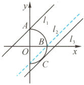 当动直线$y = x + m$位于$B(1,0)$时,$m = - 1$;当动直线$y = x + m$与圆相切时,$m = - \sqrt{2}$;