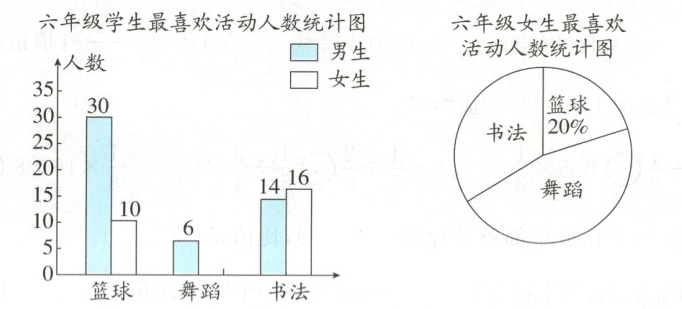 (1)六年级喜欢这三类活动的男生共有多少人?女生喜欢舞蹈的有多少人?(3分)