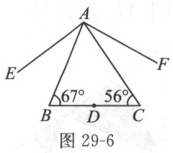 4. (2024 乌鲁木齐期末)如图 29-6,在$\triangle ABC$中,$\angle B = 67^{\circ}$,$\angle C = 56^{\circ}$,$D$为$BC$上任意一点(不与点$B,C$重合),将点$D$分别以$AB,AC$为对称轴,画出对称点$E,F$,并连接$AE,AF$,则$\angle EAF$的度数为