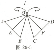 例 2(2024 福建)小明用两个全等的等腰三角形设计了一个“蝴蝶”的平面图案,如图 29-5. 其中$\triangle OAB$与$\triangle ODC$都是等腰三角形,且它们关于直线$l$对称,$E,F$分别是底边$AB,CD$的中点,$OE\perp OF$. 下列推断错误的是(