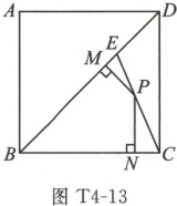 如图 T4-13,在边长为$a$的正方形$ABCD$中,$E$是对角线$BD$上一点,且$BE = BC$,$P$是$CE$上一点,则点$P$到$BD$,$BC$的距离之和$PM + PN$的值