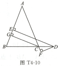 如图 T4-10,在$\triangle ABC$中,$AB = AC$,$D$是$BC$延长线上的一点,$DE \perp AB$于点$E$,$DF \perp AC$,交$AC$的延长线于点$F$,$CG \perp AB$于点$G$,则线段$CG$,$DE$,$DF$三者之间的数量关系是