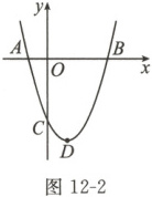 例 2 思维能力一题多变 如图 12-2,抛物线$y = ax^{2} + bx + c$的顶点为$D(1, -4)$,与$x$轴交于点$A(-1, 0), B(3, 0)$,与$y$轴交于点$C(0, -3)$. 请根据图象,回答下列问题: