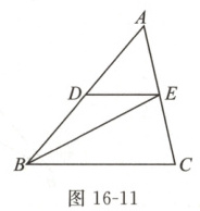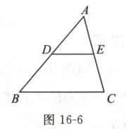 例 3 思维能力 一题多变 如图 16-6,DE 是$\triangle ABC$的中位线. 若$BC = 8 cm$,则$DE =$