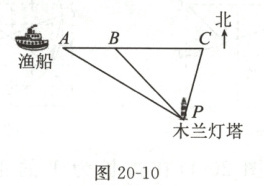 例 4(2025 临沂模拟)木兰灯塔是亚洲最高、世界第二高的航标灯塔,位于海南岛的最北端,是海南岛东北部最重要的航标. 某天,一艘渔船自西向东(沿 $AC$ 方向)以 10 海里/时的速度在琼州海峡航行,如图 20-10 所示.