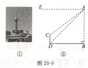 例 3(2024 吉林)图 20-9①中的吉林省广播电视塔,又称“吉塔”. 某直升机于空中 $A$ 处探测到吉塔,此时飞行高度 $AB = 873$ m,如图②. 从直升机上看塔尖 $C$ 的俯角 $\angle EAC = 37°$,看塔底 $D$ 的俯角 $\angle EAD = 45°$,求吉塔的高度 $CD$(结果精确到 $0.1$ m).