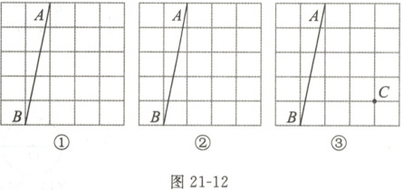 例8(2025长春模拟)图21-12①②③均是$5×5$的正方形网格,每个小正方形的边长均为1,每个小正方形的顶点称为格点,点$A$,$B$,$C$均在格点上,只用无刻度的直尺,分别在给定的网格中按下列要求作图,保留作图痕迹.