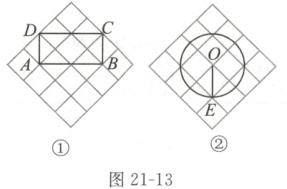 5.(2024吉林)图21-13①②均是$4×4$的正方形网格,每个小正方形的顶点称为格点.点$A$,$B$,$C$,$D$,$E$,$O$均在格点上.图①中已画出四边形$ABCD$,图②中已画出以$OE$为半径的$\odot O$.只用无刻度的直尺,在给定的网格中按要求画图.