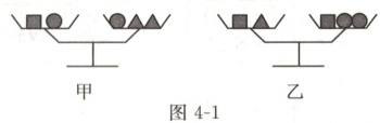 1. (2024贵州)小红学习了等式的性质后,在甲、乙两台天平的左右两边分别放入“$■$”“$●$”“$▲$"三种物体,如图4-1所示,天平都保持平衡.若设“$■$”与“$●$”的质量分别为$x,y$,则下列关系式正确的是 (