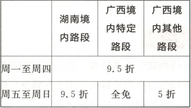 例4(2025广西)自2025年5月9日起至2025年12月31日,周末自驾游广西的外省籍小客车,可享受高速公路车辆通行费(以下简称高速费)优惠.小悦一家5月中旬从湖南自驾到广西探亲游玩,此次全程所产生的高速费享受的优惠如下: