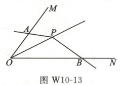 1. 如图 W10 - 13,$P$ 为 $\angle MON$ 的平分线上一点,$\angle APB$ 的两边分别与射线 $OM$,$ON$ 交于 $A$,$B$ 两点,$\angle APB$ 绕点 $P$ 旋转时始终满足 $OA· OB = OP^{2}$。若 $\angle MON = 54^{\circ}$,则$\angle APB$ 的度数为(