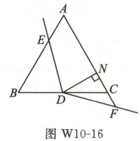 (4)当 $\angle EDF$ 绕点 $D$ 顺时针旋转到如图W10 - 16 的位置时,$DF$ 与线段 $AC$ 的延长线相交于点 $F$,作 $DN\perp AC$ 于点 $N$。若 $DN =$ $FN$,$AB = 10$,直接写出 $BE + CF$ 的值。