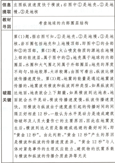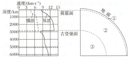 读地震波波速与地球内部构造图,完成(1)~(3)题。