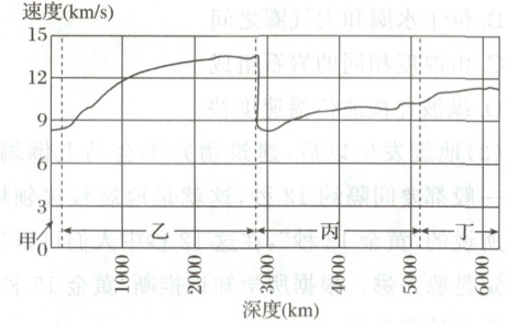 1.B 2.A 第1题,据图中信息,可以判断出甲是地壳,地壳的厚度不均,A错误;乙是地幔,地幔当中有岩浆物质,B正确;丙是外核,地球外核为熔融态的液体,C错误;丁是内核,地球外核的物质运动形成地球磁场,D错误。第2题,据图中信息可以判断出,图中地震波能够在外核中传播,所以可以判断出是纵波;传播速度相对较快,波速变化比较显著;纵波可以在气态中进行传播,所以可以通过气态。故选A。