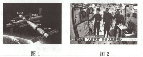 2021年10月16日0时23分,搭载神舟十三号载人飞船的长征二号F遥十三运载火箭,在酒泉卫星发射中心按照预定时间精准点火发射,顺利将3名航天员送入太空,飞行乘组状态良好,发射取得圆满成功。2021年12月9日15:40,“天宫课堂”第一课正式开讲,“太空教师”们在中国空间站(图1)为广大青少年带来了一场精彩的太空科普课,这是中国空间站首次太空授课活动(图2)。据此完成(1)~(2)题。