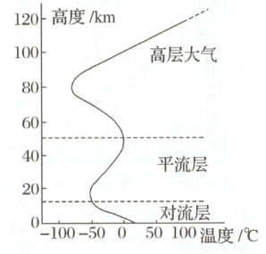 “嫦娥六号”返回器携带月壤样本成功降落在内蒙古四子王旗预定地点,返回任务取得圆满成功。根据大气的温度、密度和运动状况在垂直方向上的差异,将大气分为三层。下图示意地球大气气温垂直变化。据此完成 3~5 题。