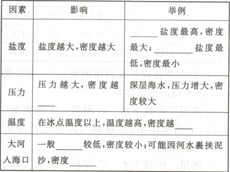 不同,标准吨位船只的核载重量需要考虑不同海区海水密度的差异。②海水的密度差异会产生密度流。