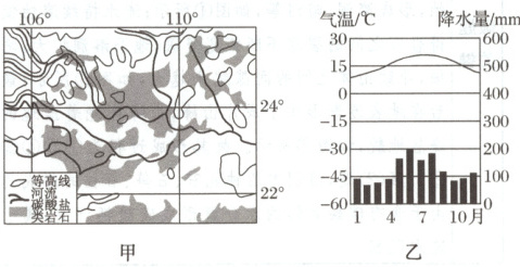 喀斯特地貌特指可溶性岩石(主要是分布最广的碳酸盐类岩石)经以溶蚀为主导的喀斯特作用,形成地面坎坷嶙峋、地下洞穴发育的特殊地貌。下图为某地位置示意图(图甲)和该地气温与降水资料图(图乙)。