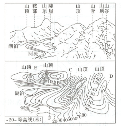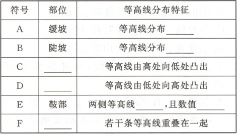 A:稀疏 B:密集 C:山脊 D:山谷 E:对称分布;相等 F:陡崖