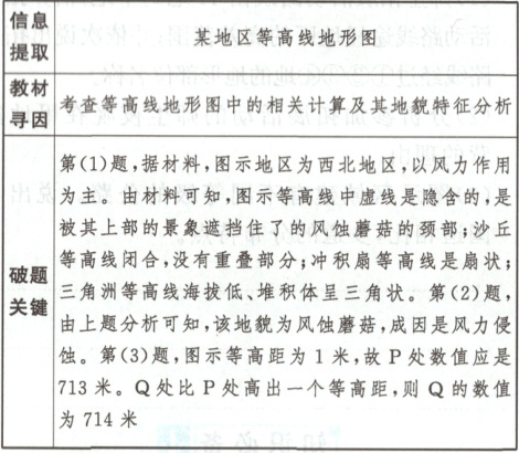 1.B 2.B 第1题,由材料中信息可知,图中地貌为风积地貌,结合图中等高线形状,可知该地貌类型为新月形沙丘。故选B。第2题,新月形沙丘迎风坡缓,等高线稀疏;背风坡陡,等高线密集,结合图中指向标可知,图示地区盛行风为西北风。故选B。
