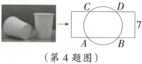 4. 某一次的综合实践主题为:只用一张矩形纸条和刻度尺,如何测量一次性纸杯杯口的直径?小聪同学所在的学习小组想到了如下方法:如图,将纸条拉直并紧贴杯口,纸条的上下边沿分别与杯口相交于$A$,$B$,$C$,$D$四点,然后利用刻度尺量得该纸条的宽为$7\mathrm{cm}$,$AB = 8\mathrm{cm}$,$CD = 6\mathrm{cm}$。请你帮忙计算纸杯的直径为