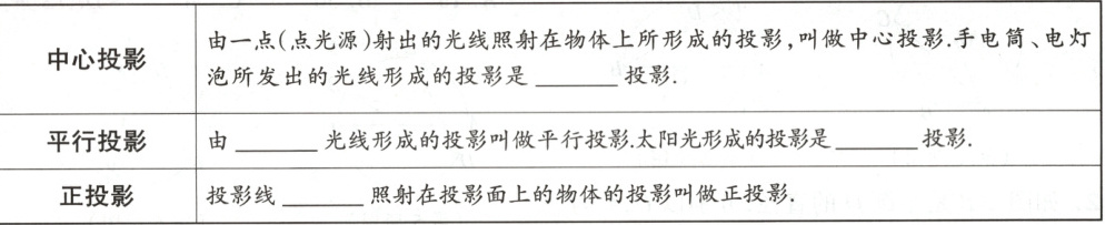 1. [冀九下 P92 练习改编] 下列各种现象:①阳光下沙滩上人的影子;②晚上人走在路灯下的影子;③中午用来乘凉的树影;④阳光下旗杆的影子;⑤舞台上演员的影子.其中属于中心投影的是