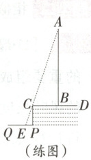 练 如图,安装路灯 $AB$ 的路面 $CD$ 比种植树木的地面 $PQ$ 高 $CP = 1.2\mathrm{m}$,在路灯的照射下,路基 $CP$ 留在地面上的影长 $EP$ 为 $0.4\mathrm{m}$,通过测量知道 $BC$ 的距离为 $1.5\mathrm{m}$,则路灯 $AB$ 的高度是 (