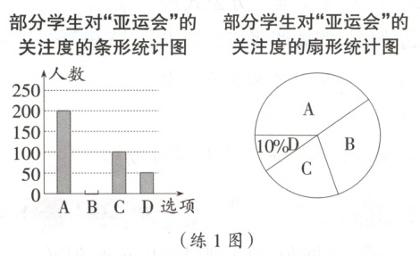 练 1 [25·邯郸 25 中一模] 第 19 届亚洲运动会在杭州举行.某高校为了解学生对亚运会的关注度,设置了 $ A $(非常关注)、 $ B $(比较关注)、 $ C $(很少关注)、 $ D $(没有关注)四个选项,随机抽取了部分学生进行了问卷调查,并将调查结果绘制成如图所示的两幅不完整的统计图.根据图中所提供的信息,解答下列问题: