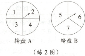 练 2 在某次数学活动中,有两个如图所示的转盘 $ A $, $ B $,转盘 $ A $ 被分成四个相同的扇形,分别标有数字 1,2,3,4,转盘 $ B $ 被分成三个相同的扇形,分别标有数字 5,6,7,指针固定不变,转动转盘(如果指针指在等分线上,那么重新转动,直至指针指在某个扇形区域内为止).