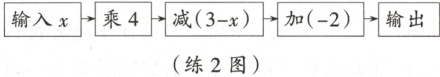 练2 解:根据题意,得$4x - (3 - x) + (-2) = 5$,去括号,得$4x - 3 + x - 2 = 5$,移项、合并同类项,得$5x = 10$,系数化为1,得$x = 2$,即输入的$x$的值为2.