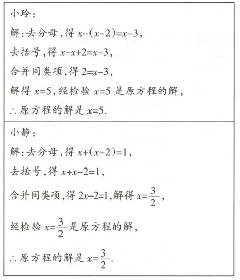3. 老师让小玲和小静到黑板上分别解方程$\frac{x}{x - 3}-\frac{x - 2}{3 - x}=1$,两人的解题过程如下: