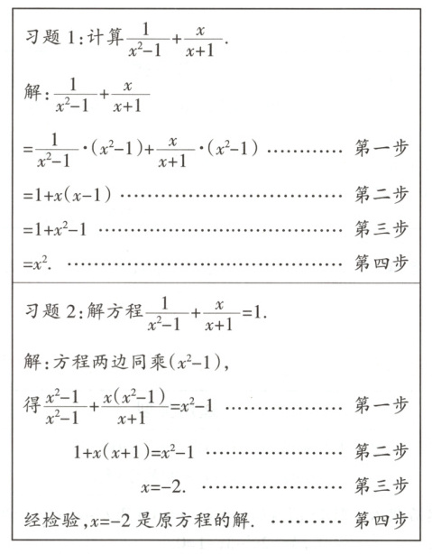 (2)习题1: 原式$=\frac{1}{(x+1)(x-1)}+\frac{x(x-1)}{(x+1)(x-1)} $$=\frac{x^{2}-x+1}{(x+1)(x-1)}=\frac{x^{2}-x+1}{x^{2}-1} $习题2:$\frac{1}{x^{2}-1}+\frac{x}{x+1}=1,$方程两边同乘$(x^{2}-1),$得$1+x(x-1)=x^{2}-1,$ 解得x=2.经检验x=2是原分式方程的解.