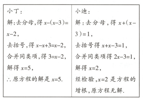 2. [25·邯郸 25 中一模] 小丁和小迪解方程$\frac{x}{x - 2}-\frac{x - 3}{2 - x}=1$的过程分别如下: