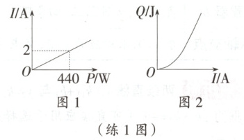 练 1 [新考法] 把多个用电器连接在同一个插线板上,同时使用一段时间后,插线板的电源线会明显发热,存在安全隐患。数学兴趣小组对这种现象进行研究,得到时长一定时,插线板电源线中的电流 $ I $ 与使用电器的总功率 $ P $ 的函数图象(如图 1),插线板电源线产生的热量 $ Q $ 与 $ I $ 的函数图象(如图 2)。下列结论中错误的是 (