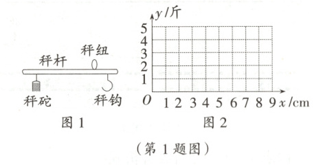 【建立模型】如图1,可以用秤砣到秤纽的水平距离,来得出秤钩上所挂物体的质量。称重时,若秤杆上秤砣到秤纽的水平距离为$x(cm)$,秤钩所挂物重为$y$(斤),则$y$是$x$的一次函数,表中为校准秤杆时若干次称重所记录的一些数据。