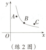 练 2 [25·邯郸模拟] 劳动教育课上,徐老师带领九(1)班同学对三类小麦种子的发芽情况进行了统计(种子的培养环境相同).如图,用$A$,$B$,$C$三点分别表示三类种子的发芽率$y$与该类种子用于实验的数量$x$的情况,其中点$B$在反比例函数图象上,则三类种子中,发芽数量最多的是