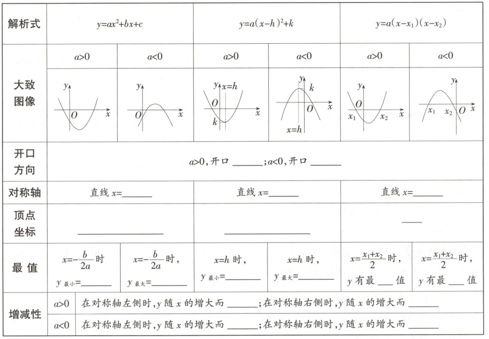向上 向下 $-\frac{b}{2a}$ $\frac{x_{1}+x_{2}}{2}$$\begin{pmatrix}-\frac{b}{2a},\frac{4ac - b^{2}}{4a}\end{pmatrix}$ $(h,k)$ $\frac{4ac - b^{2}}{4a}$$\frac{4ac - b^{2}}{4a}$ $k$ $k$ 小 大 减小增大 增大 减小