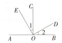 1. [人七上 P138 练习改编] 如下左图,$ A,O,B $ 在同一条直线上,$ \angle AOC=\angle BOC $,若 $ \angle 1=\angle 2 $,则图中互余的角共有