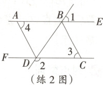练 2 [优质原创] 如图,直线 $ BD $ 分别交 $ AE,CF $ 于点 $ B,D $,连接 $ AD,BC $,若 $ DA $ 平分 $ \angle BDF $,$ \angle 3= \angle 4 $,若 $ \angle 1=50^{\circ} $,$ \angle 2= 130^{\circ} $,则 $ \angle CBD $ 的度数为 (
