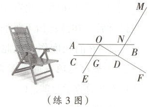 练 3 如图是一种躺椅及其简化结构示意图,扶手 $ AB $ 与底座 $ CD $ 都平行于地面 $ EF $,前支架 $ OE $ 与后支架 $ OF $ 分别与 $ CD $ 交于点 $ G $ 和点 $ D $,$ AB $ 与 $ DM $ 交于点 $ N $,$ \angle AOE=\angle BNM $.