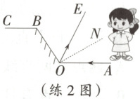 练 2 [25·深圳] 如图为小颖在试鞋镜前的光路图,入射光线 $ OA $ 经平面镜后反射入眼,若 $ CB// OA $,$ \angle CBO=122^{\circ} $,$ \angle BON=90^{\circ} $,则入射角 $ \angle AON $ 的度数为 (